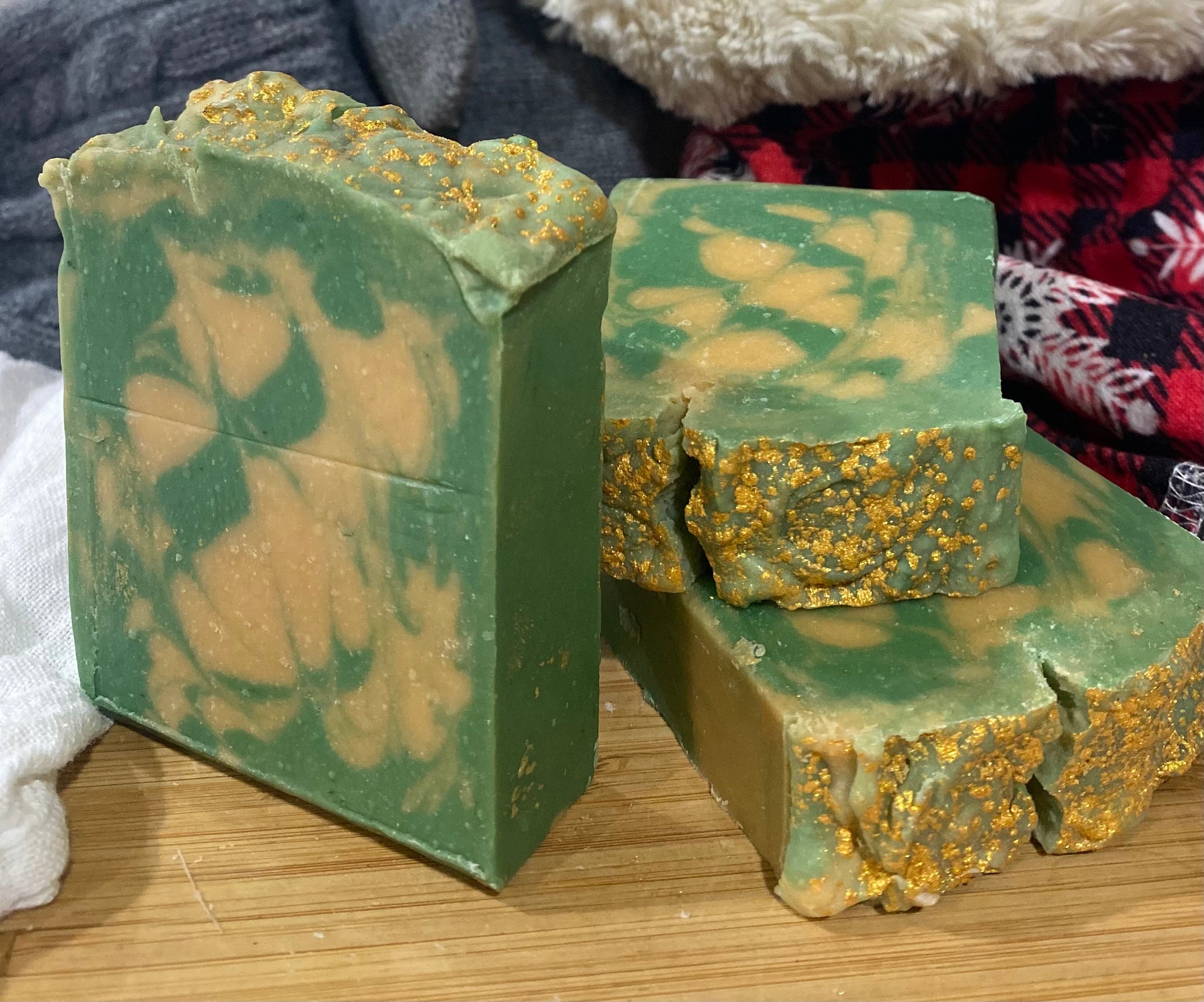 Wrap yourself in the warmth of the holidays with Jingle All the Way, a festive blend of cinnamon, clove, vanilla, and cozy seasonal spice. This bar features elegant green and gold swirls, topped with a dusting of sparkling gold for a touch of Christmas magic. Made with my signature recipe for a creamy, gentle lather, this holiday soap brings cheer to every sink and shower.